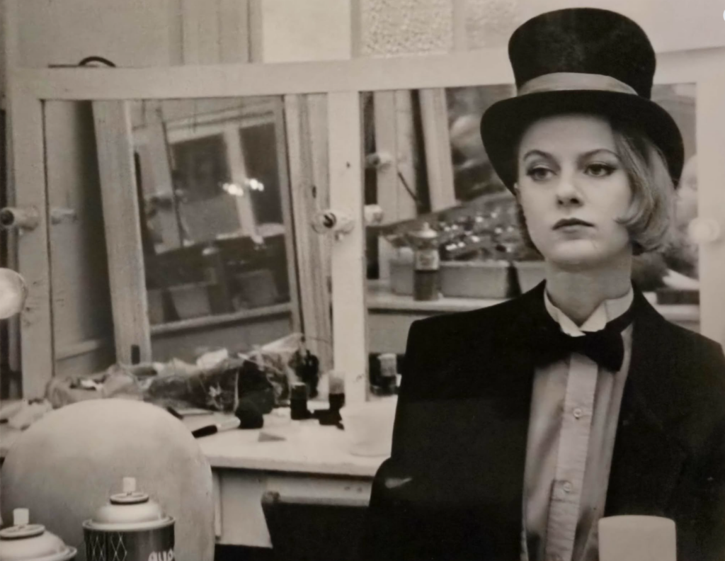 I remember feeling so serious and nervous when I took this picture. (You can’t see my camera — it’s tucked just below that can of Aqua Net in the mirror.) I loved being on stage, but Feste carried a lot of lines, a lot of songs, and a lot of emotional tone. There’s a stillness in my expression here that, to me, perfectly captures that mix of excitement and fear — the private moment just before stepping into someone else’s skin.